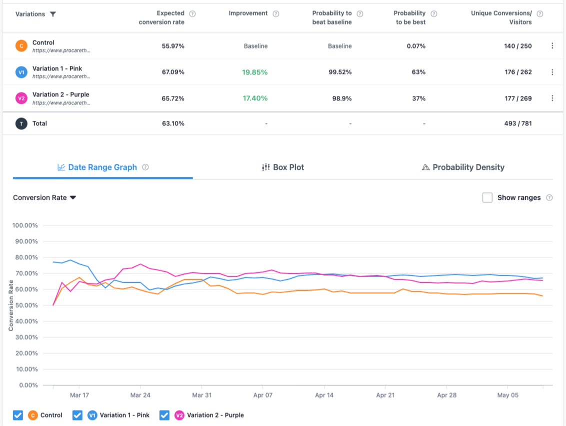 Although the pink version slightly outperformed purple, the difference in performance is narrowing, and accessibility improvements make purple the best long-term choice. We recommended: